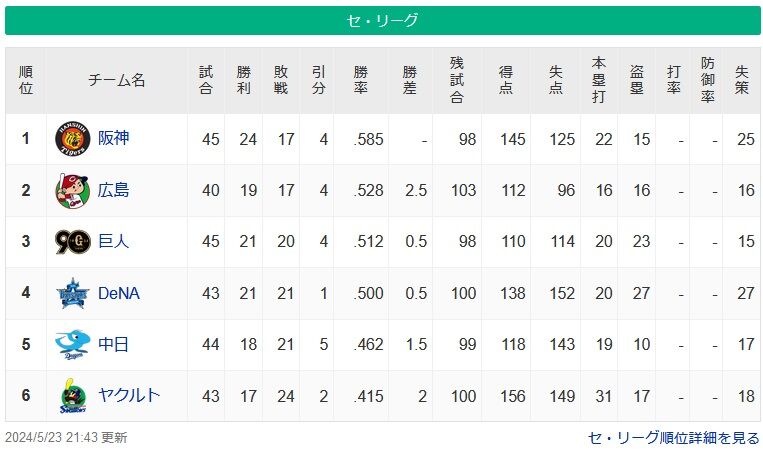 【セ順位スレ】神—–広-巨-De—中—-ヤ【5/23】
