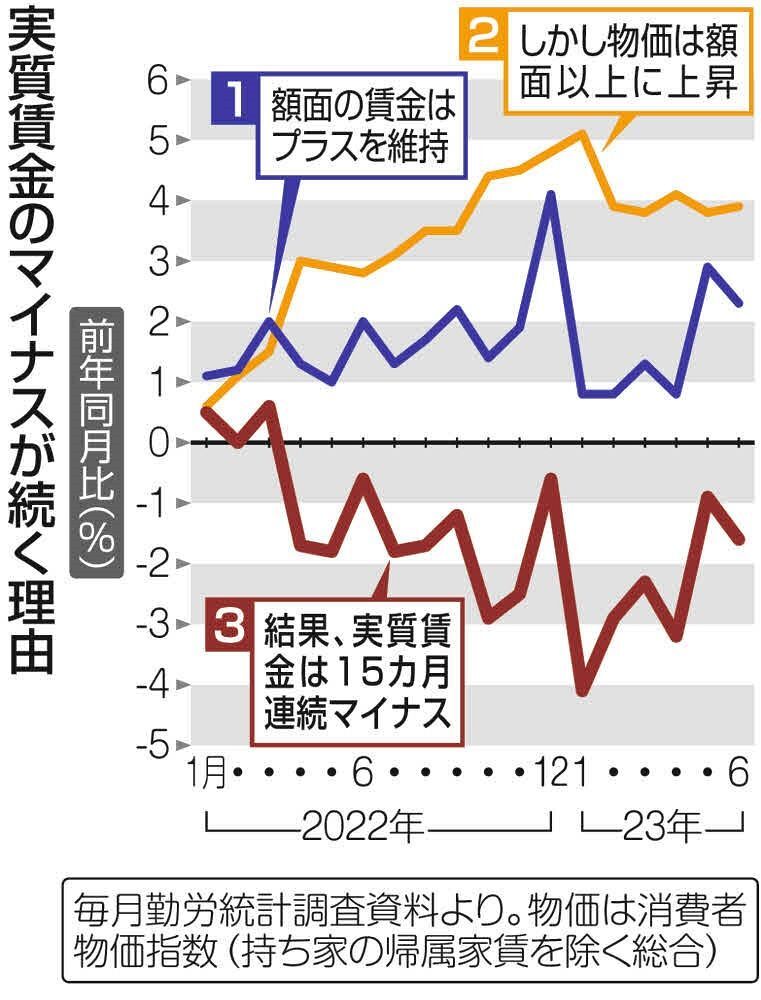 4月の実質賃金が25カ月連続マイナスに 基本給・通勤手当など含まれた所定内給与は増加 厚生労働省