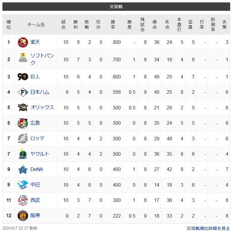 【6/7】交流戦鷲=鷹=兎-公-檻鯉鴎燕=星龍=猫-虎