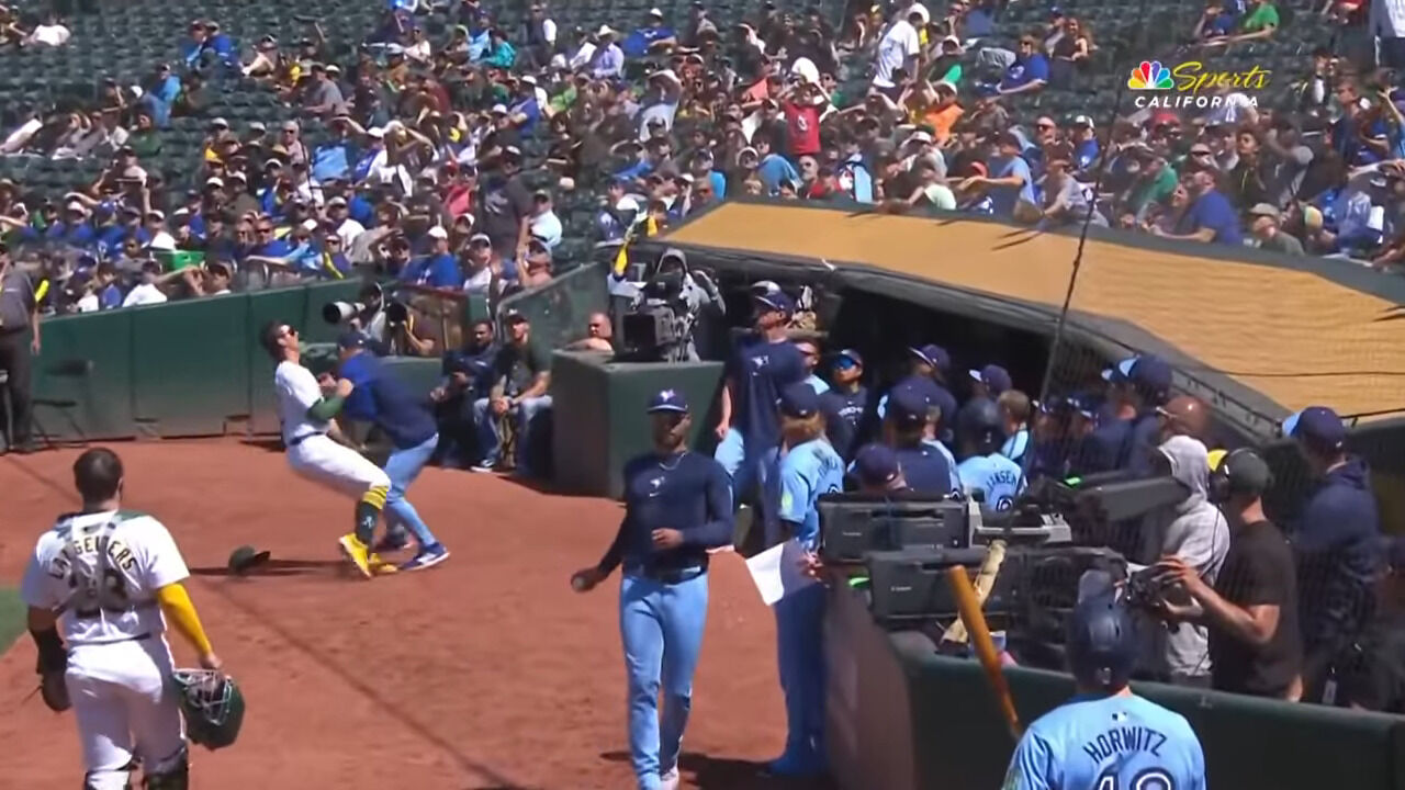 3点リードした10回、ブルージェイズの9番、デービス・シュナイダー選手が1アウト二塁の場面で一塁側のファウルゾーンにフライを打った際、打球をよけようとベンチを出た菊池投手と、ボールを追っていたアスレティックスのファーストの選手がぶつかりました。