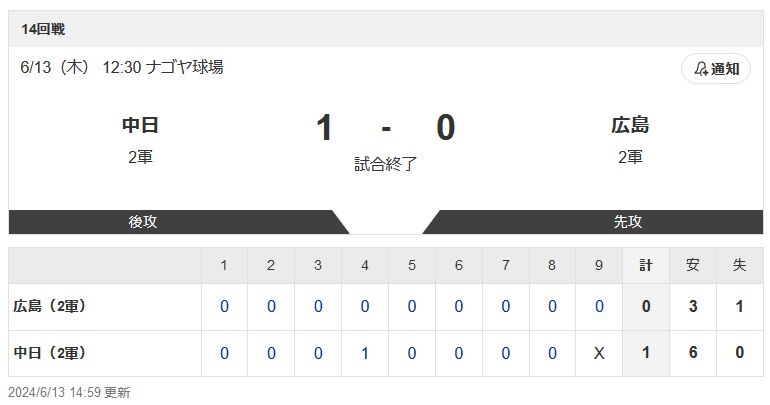 中日 1-0 広島(終了)広|0 0 0 0 0 0 0 0 0=0