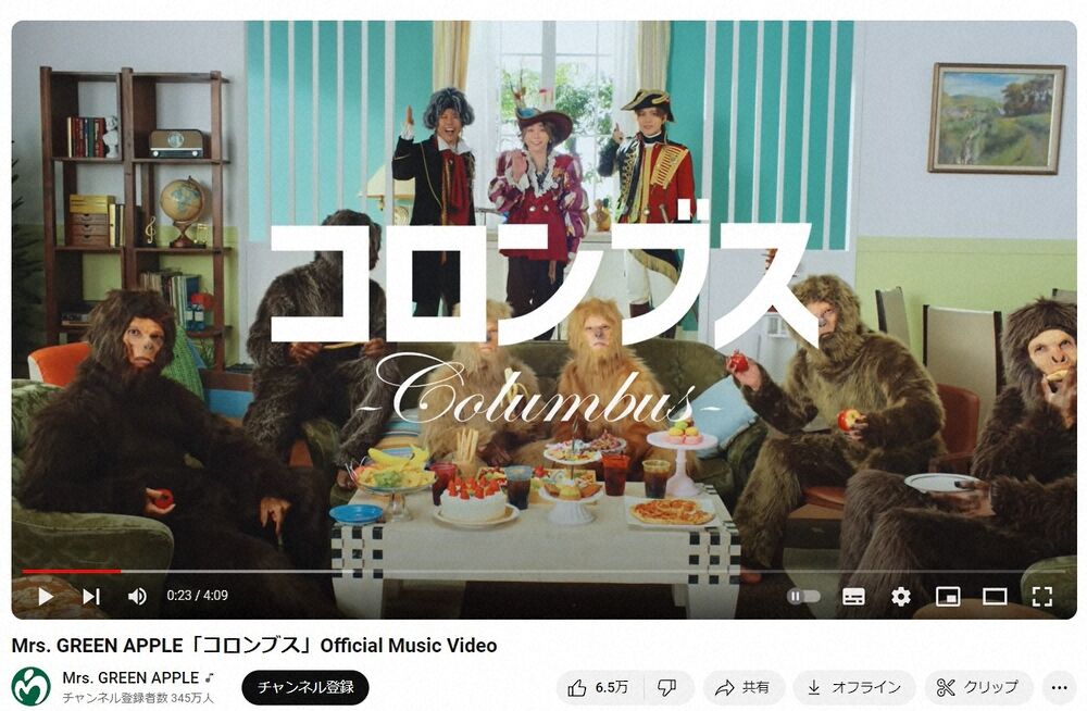 ロックバンド「Mrs.GREEN APPLE(ミセス・グリーン・アップル)」は13日、前日12日にリリースしたばかりの新曲「コロン*」のMV(ミュージックビデオ)の内容について「理解に欠ける表現があった」として謝罪。レコード会社「ユニバーサル ミュージック合同会社」は、当該MVの公開を停止することを発表した。