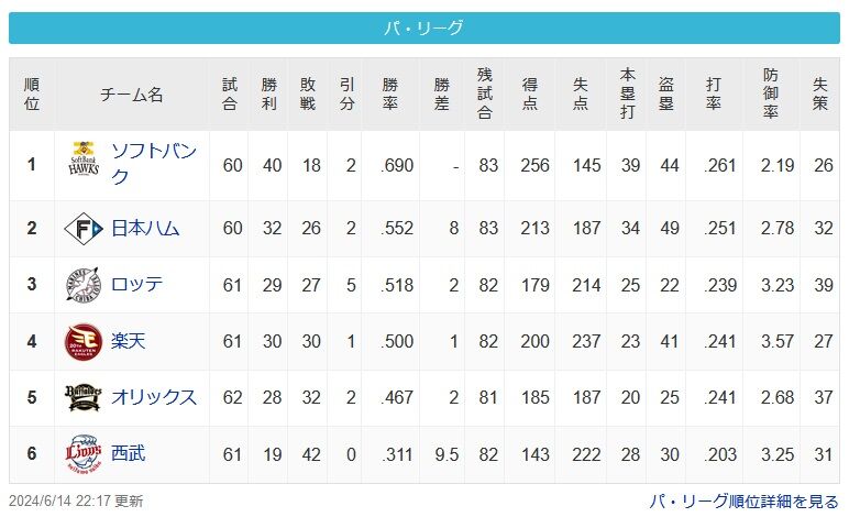 【悲報】2位ハム、首位SBと8ゲーム差…