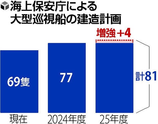 政府は2016年12月、尖閣情勢の緊迫化などを受けて海保の体制強化を決定し、現在は、69隻の大型巡視船(1000トン以上)を24年度までに77隻に増やす計画で進めている。今回、この計画に4隻を上積みし、25年度までに81隻とする。