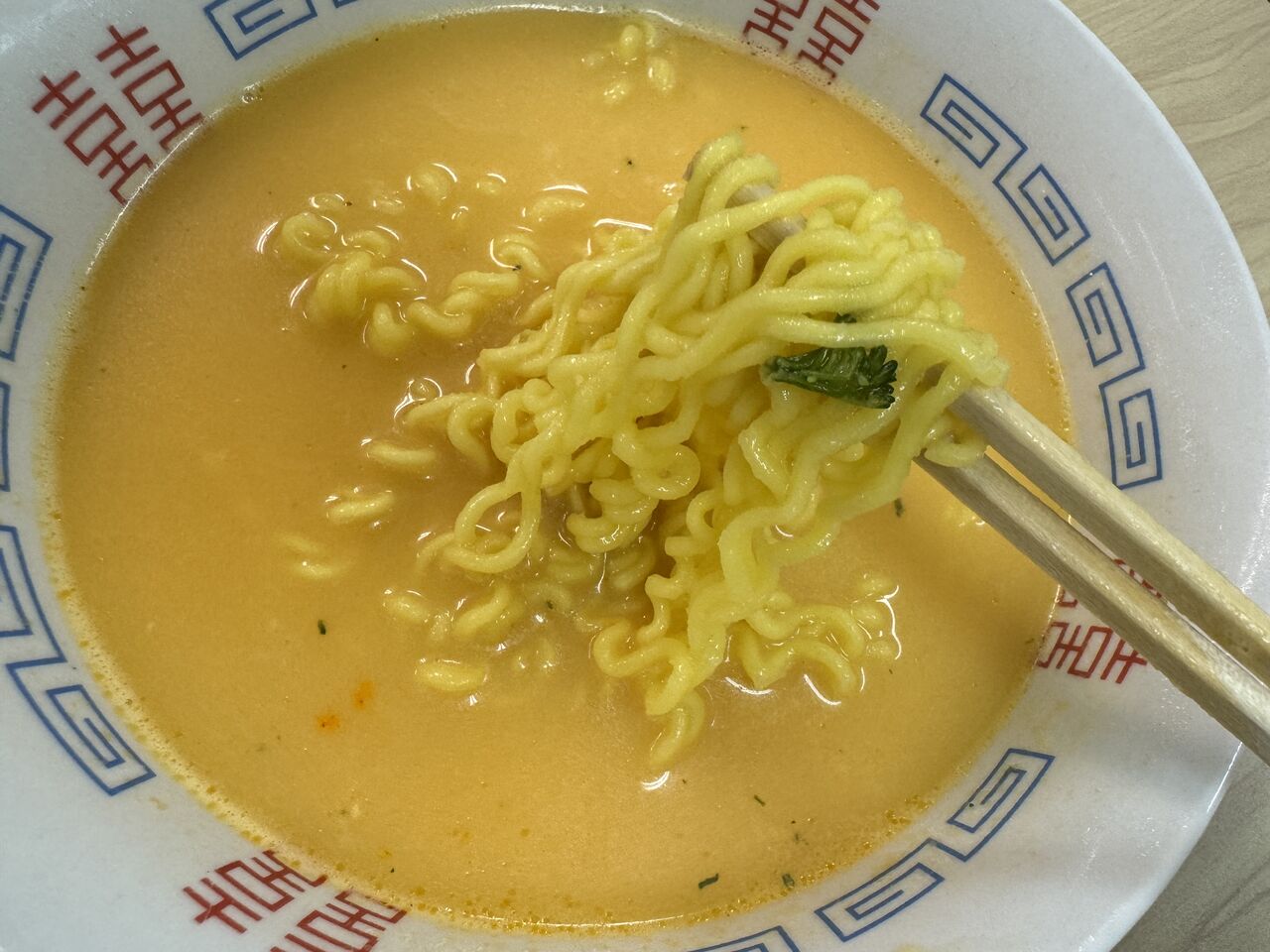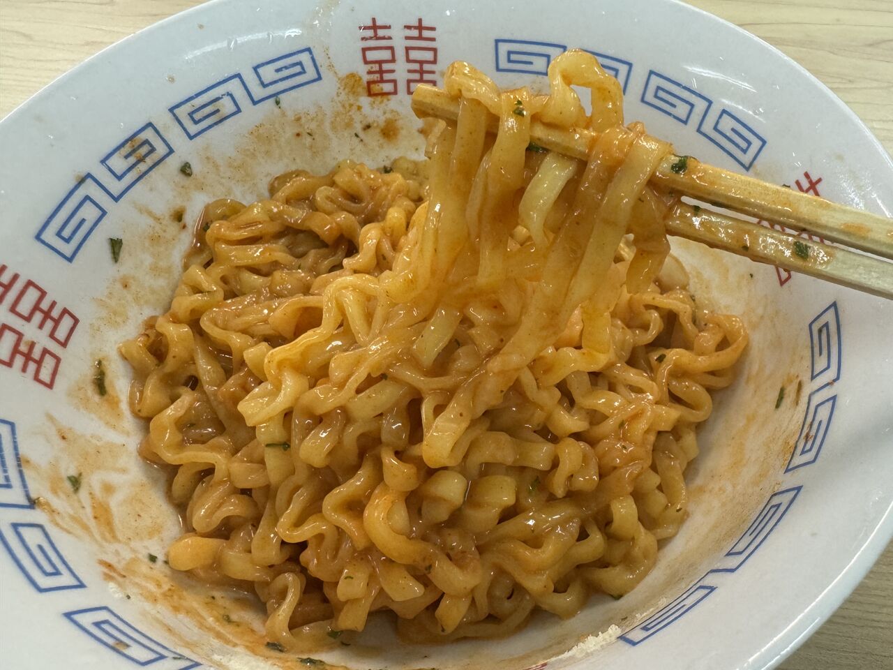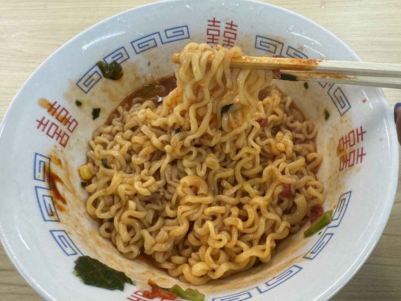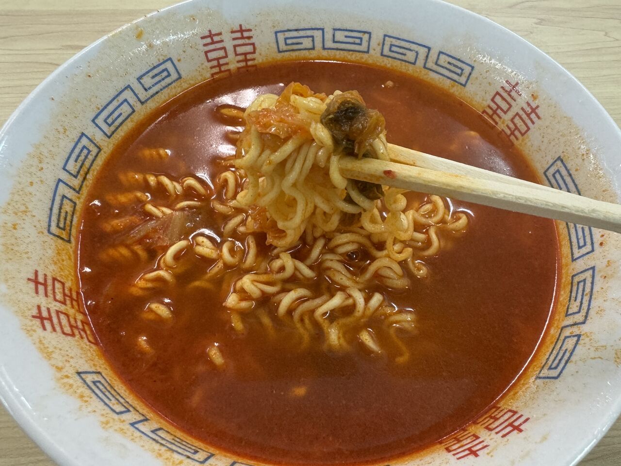 辛ラーメンほどの辛さはなく、キムチらしい酸味がある。どことなくトマトラーメンっぽさもあり、