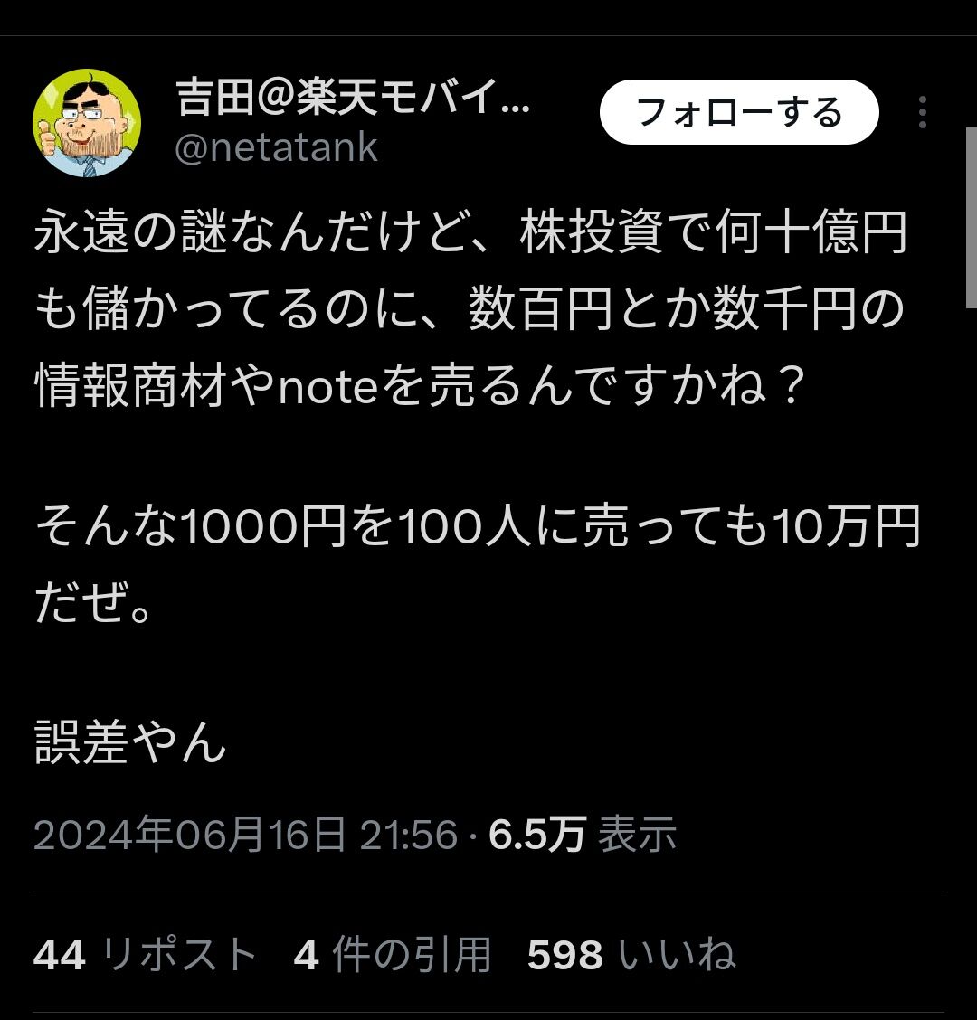 永遠の謎なんだけど、株投資で何十億円も儲かってるのに、数百円とか数千円の情報商材やnoteを売るんですかね?