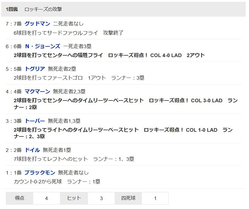 ドジャース先発ビューラー、ロッキーズ相手に初回4失点の炎上…