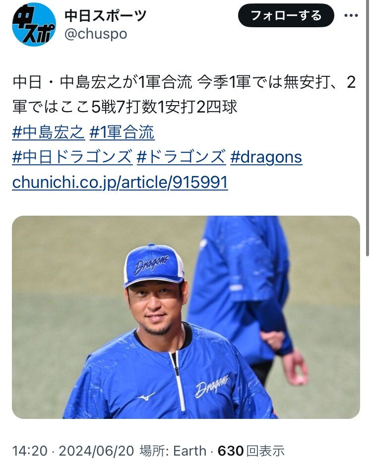 中日・中島宏之が1軍合流 今季1軍では無安打、2軍ではここ5戦7打数1安打2四球