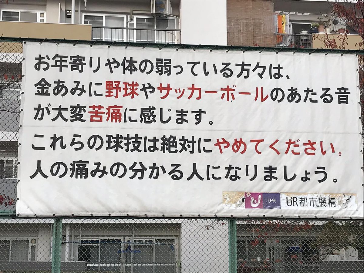 「お年寄りや体の弱っている方々は、金あみに野球やサッカーボールのあたる音が大変苦痛に感じます。これらの球技は絶対にやめてください。人の痛みの分かる人になりましょう」
