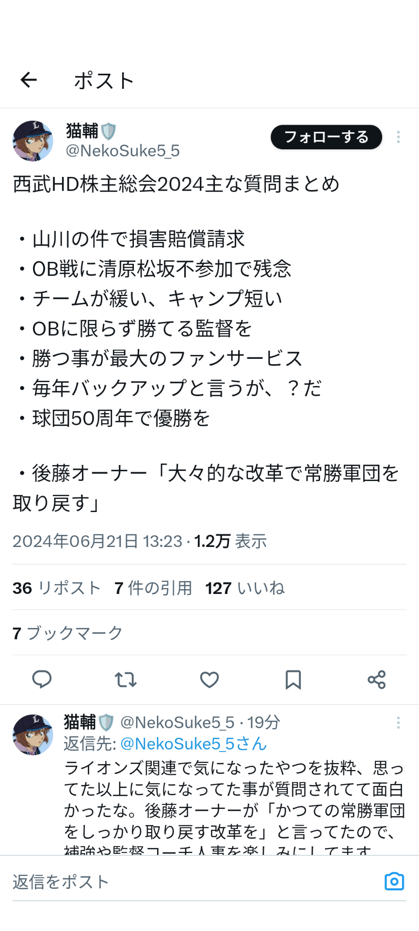 さらに別の株主からも昨年の山川の不祥事に対して「西武グループ全体の影響や損失額、損害賠償請求をしないのか」との質問も飛んだ。