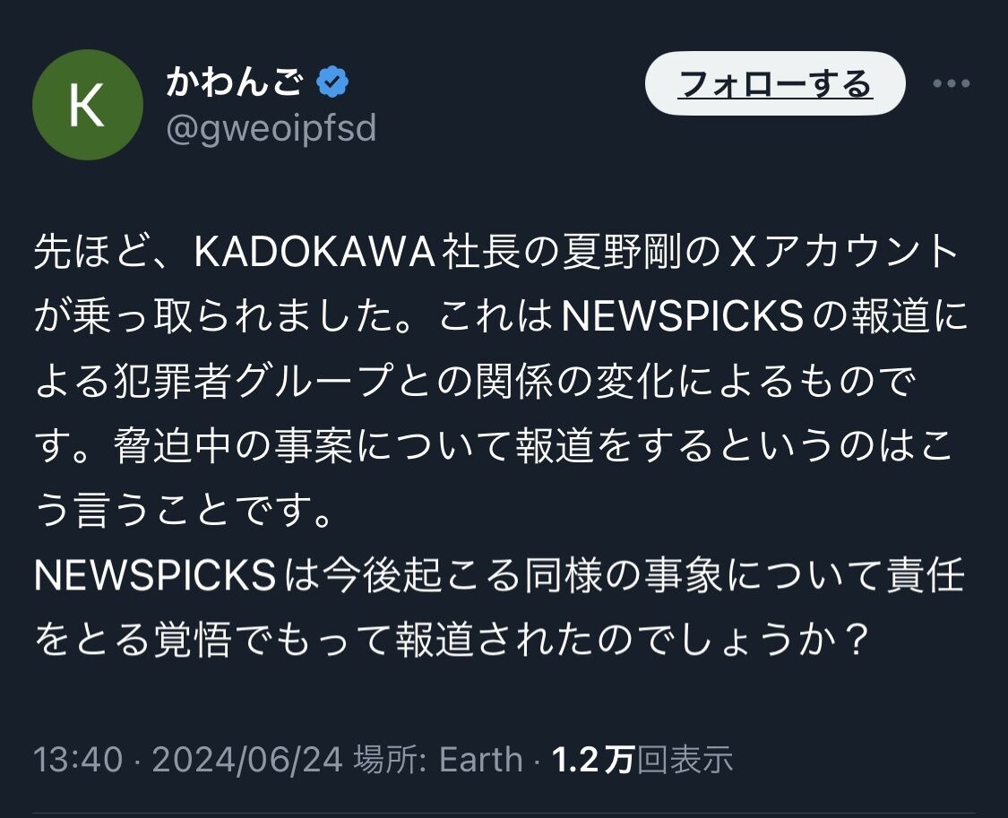 先ほど、KADOKAWA社長の夏野剛のXアカウントが乗っ取られました。これはNEWSPICKSの報道による犯罪者グループとの関係の変化によるものです。脅迫中の事案について報道をするというのはこう言うことです。