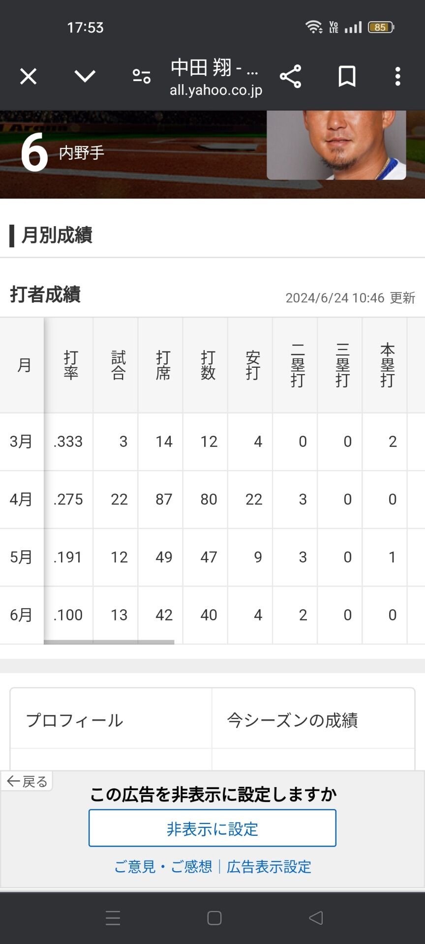 中田翔(6月)「打率.100(40-4)0本 2打点 OPS.293」←これについての率直な感想wwww