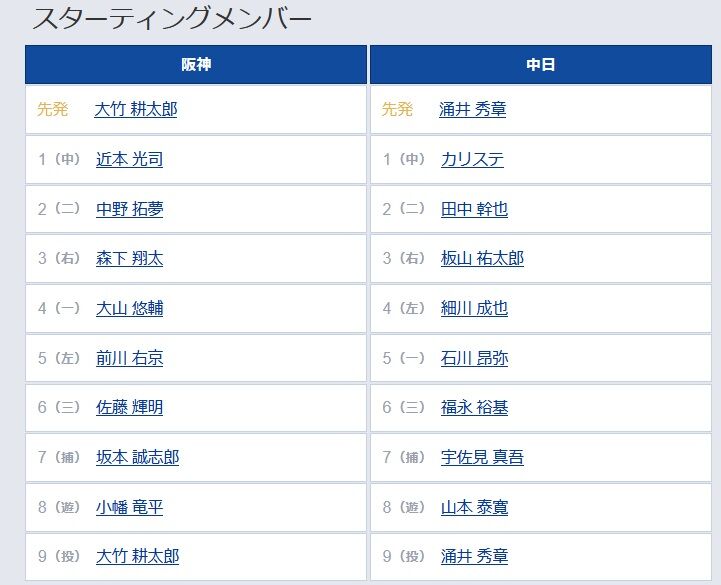 1近本 2中野 3森下 4大山 5前川 6テル 7坂本 8小幡 9大竹