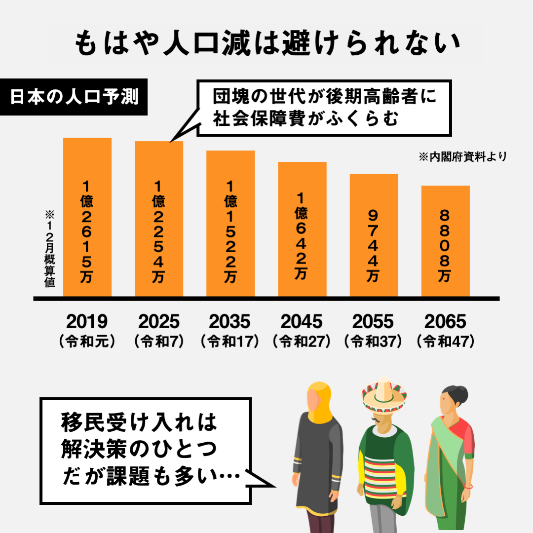 日本は今、世界に先駆けて急速な人口減少に直面している。国立社会保障・人口問題研究所(社人研)は、日本の人口が2020年時点の1億2600万人から、2120年には、将来推計人口の最も可能性が高いケースとする「中位推計」で5000万人、より悲観的な「低位推計」で3500万人まで減少すると予測する。
