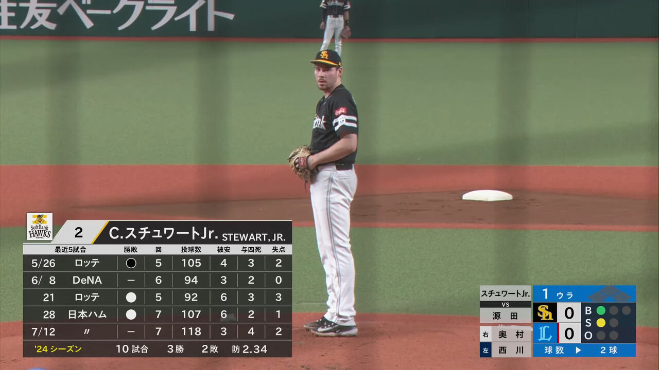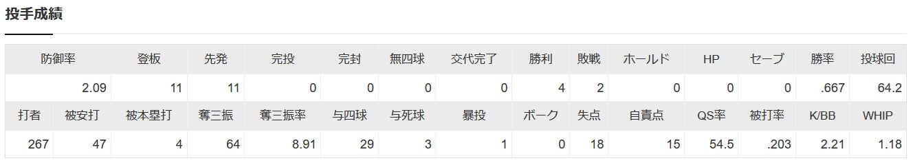 スチュワート・ジュニア(ソ)防御率2.09 4勝2敗 奪三振率8.91