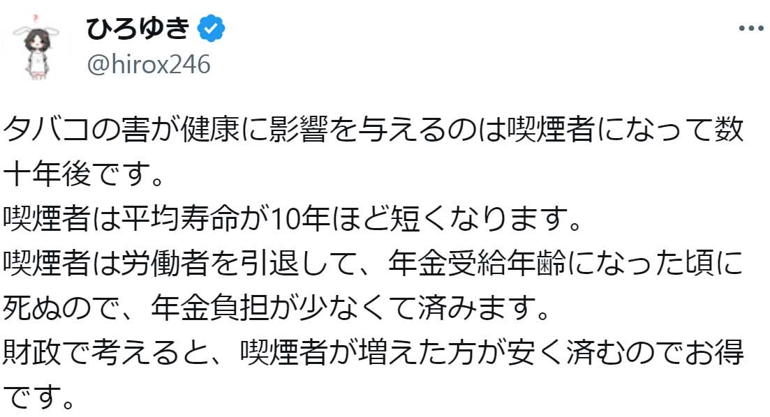 財政で考えると、喫煙者が増えた方が安く済むのでお得です。 https://t.co/DcOyLxAkW4— ひろゆき (@hirox246) July 19, 2024