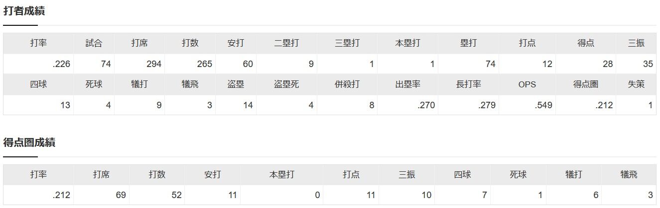ハム松本剛 .226 1本 12打点 OPS.549