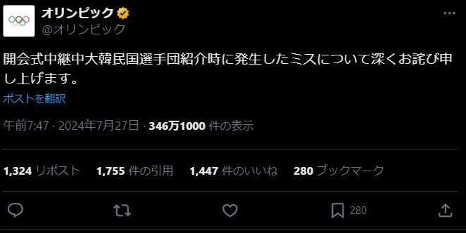 ↑北朝鮮と国名を間違えた件については、このように韓国語版のIOC公式アカウントで謝罪しています。