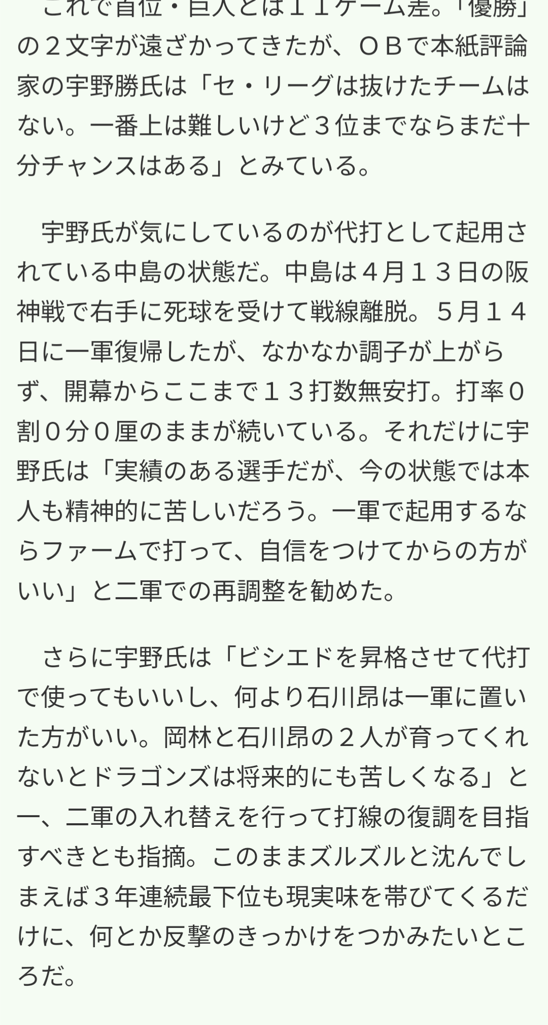 中日OB宇野「中島は二軍調整させてビシエドを代打で使え。石川昂は一軍に置いたほうがいい」