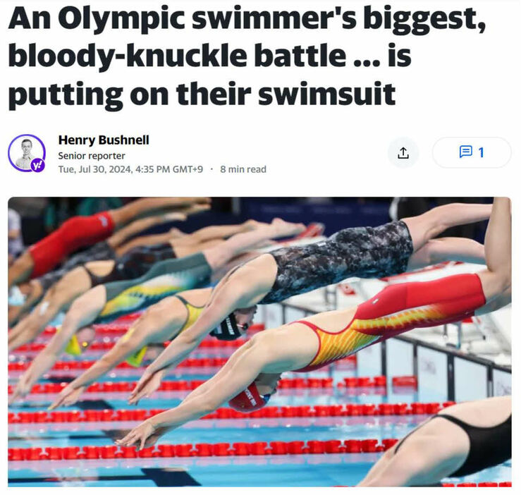 米ヤフーは「五輪競泳選手の最も血みどろの戦いは、水着を着用することだ」という記事を掲載。レースの1時間ほど前になると選手たちは体を乾かして姿を消し、見えない場所で水着との「戦いの前の戦い」を行うと記した。