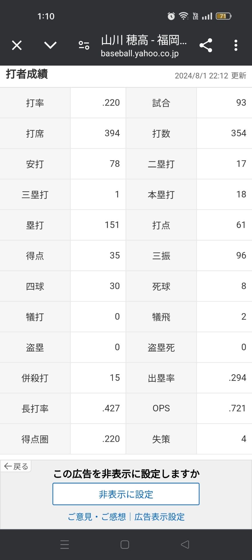 山川穂高「打率.220(354-78)18本61打点 OPS.721」←こいつについての率直な感想