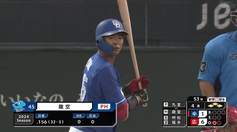 【広島対中日16回戦】中日、4回表1アウト満塁で前の打席タイムリーを打った根尾に代打・龍空