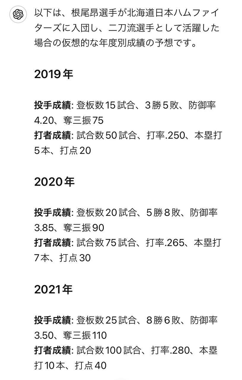 Chat GPT「根尾昂が中日ドラゴンズに行かず日本ハムファイターズに行ってたらこんな感じの成績やで」