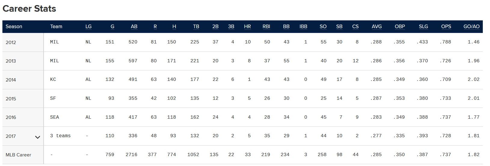 メジャー通算 6年 3044打席 打率.285 33本 出塁率.355 OPS.737 98盗塁
