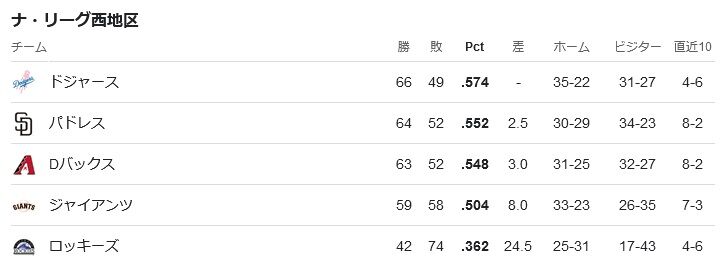 ドジャース 66勝49敗 パドレス 64勝52敗 2.5ゲーム差