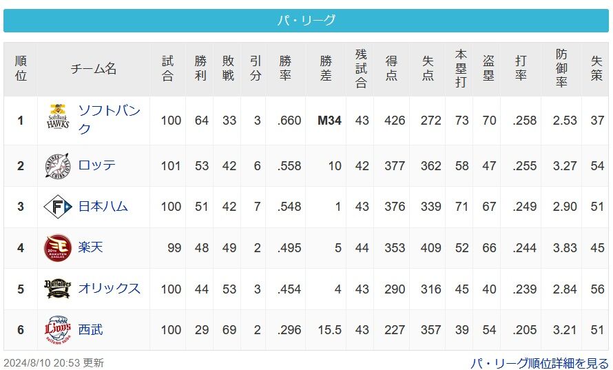 西武の勝率296 チーム打率205