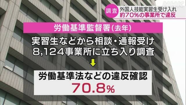 外国人技能実習生を受け入れている事業所に労働基準監督署が去年、立ち入り調査を行った結果、およそ70%の事業所で、安全管理に関する違反や違法な時間外労働などが確認されたことが、厚生労働省のまとめで分かりました。
