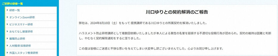 公式サイトで「弊社は2024年8月10日(土)をもって提携講師である川口ゆりとの所属契約を解消いたしました。ハラスメント防止研修講師として複数回依頼いたしましたが、本人による異性の名誉を毀損する不適切な投稿行為が認められ、契約の維持は困難と判断し、やむなく契約解除通知をするに至りました」と報告。
