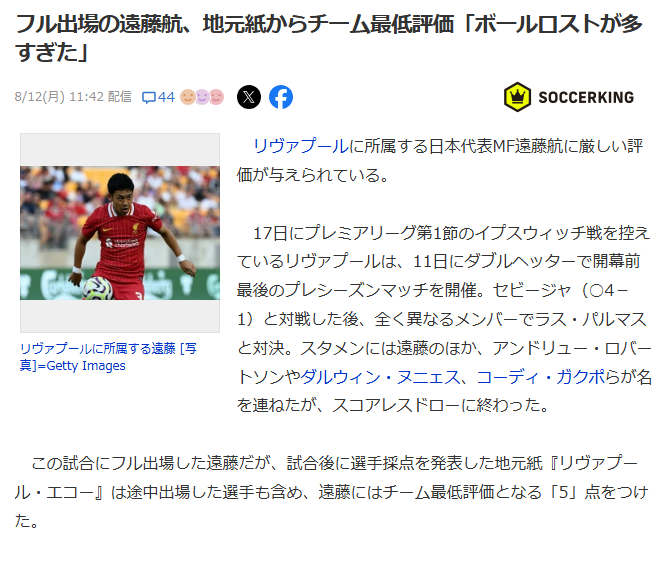 リバプール遠藤航さん、地元紙からチーム最低評価「ボールロストが多すぎた」←これwwww