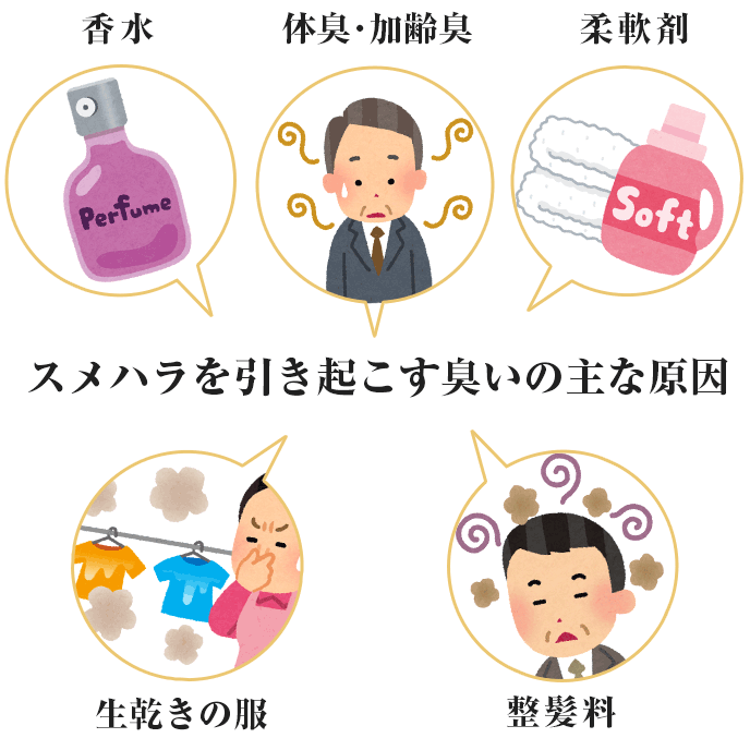 スメルハラスメント(和製英語:smell harassment)とは、においにより周囲を不快にさせるハラスメントのことである。スメハラと略される。 スメハラの原因となる臭いは様々あるが、代表的なものは体臭と口臭である。このほか、個人の食生活や衛生状態などに起因する悪臭も原因のひとつとなる。…