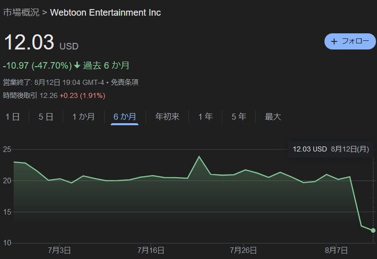 12日(現地時間)、米国ナスダック証券市場でネイバーウェブトゥーンの子会社であるウェブトゥーンエンターテイメント(NAS:WBTN)は前日比0.72ドル(5.65%)下げた12.03ドルで取引を終えた。去る9日1日で7.88ドル(38.20%)抜けて再び下ったのだ。 2取引日間時価総額は10億7847万ドル(約1兆4780億ウォン)ほど飛んだ。