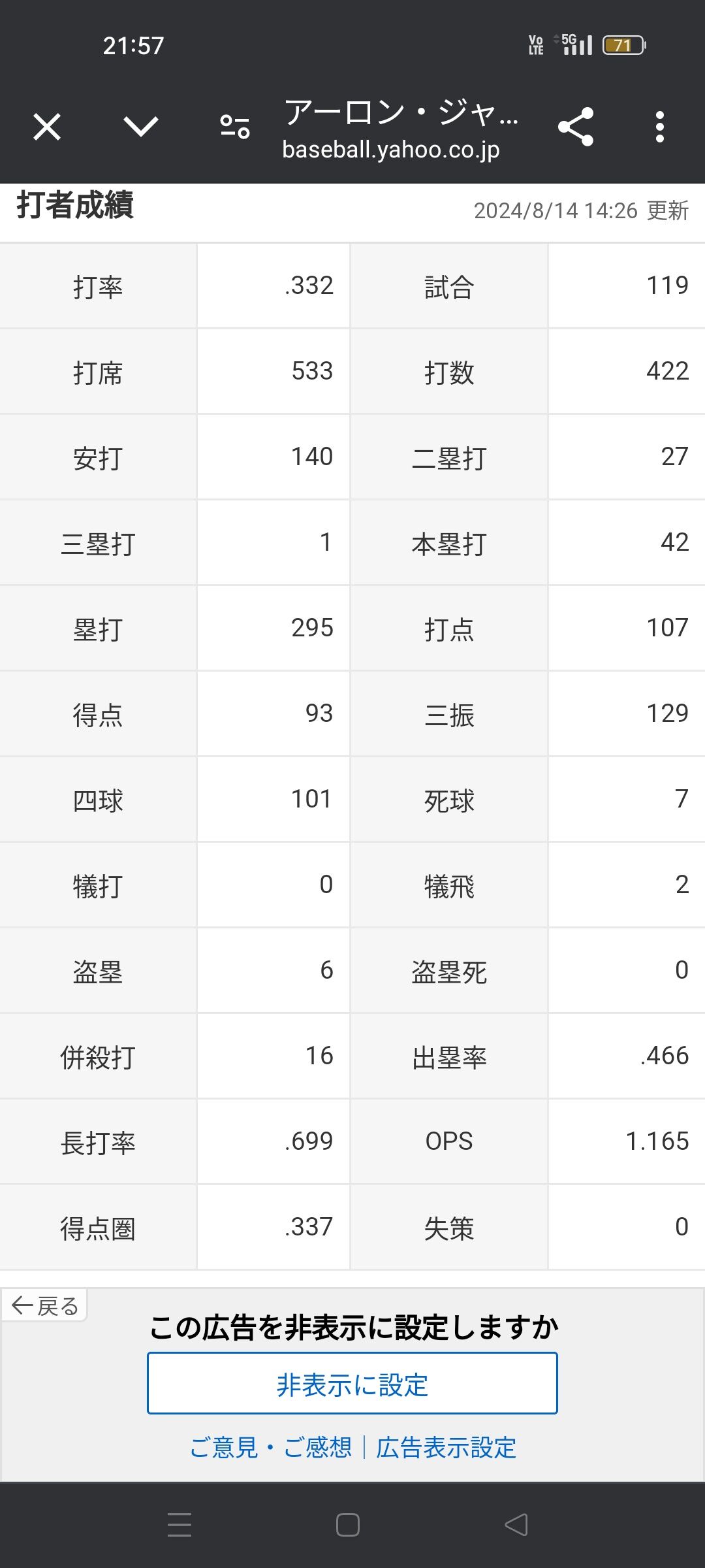 アーロン・ジャッジ「打率.332(422-140)42本 107打点 OPS1.165」←これについての感想www