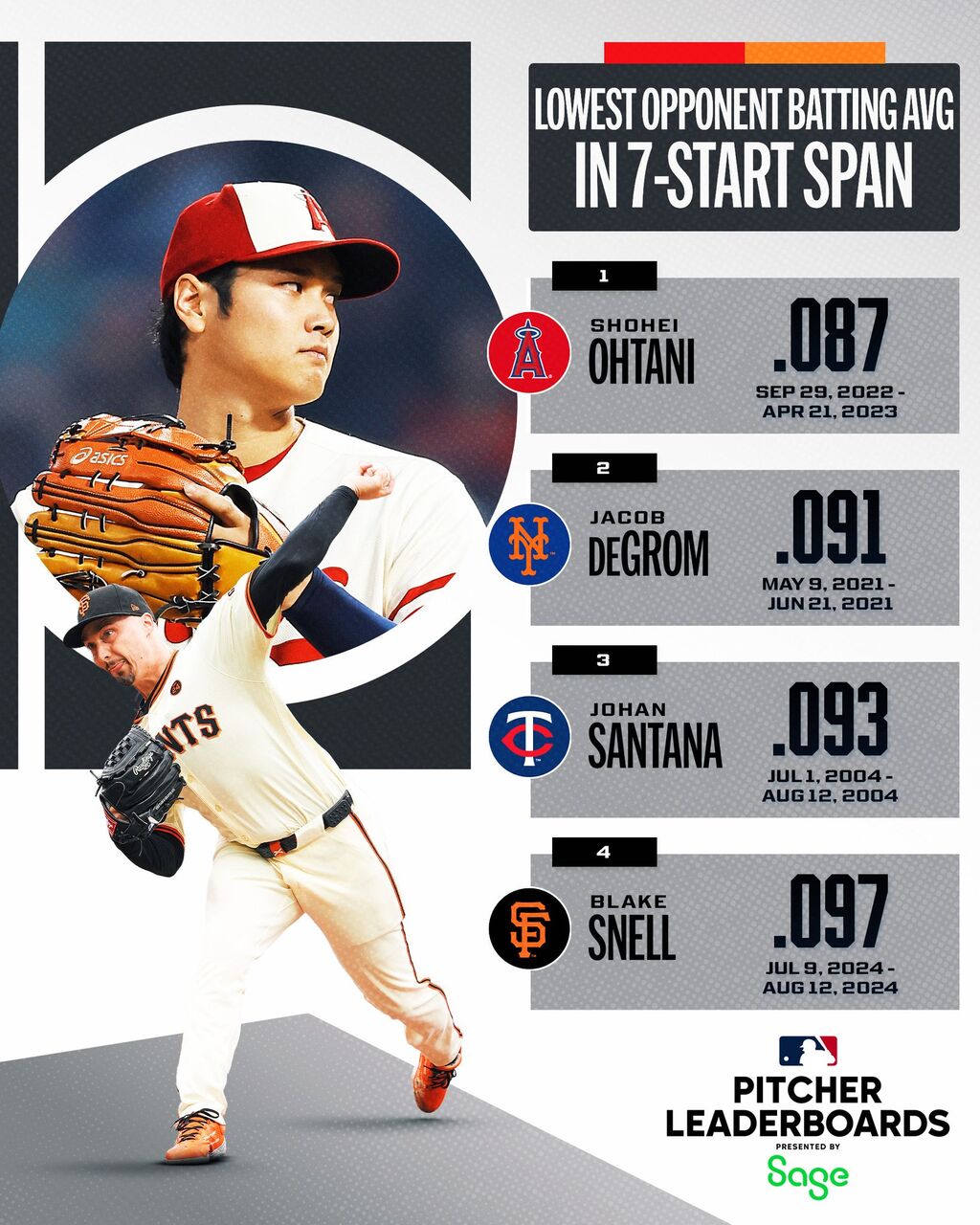 【朗報】投手大谷翔平さん、7先発期間で最も被打率が低い投手だった