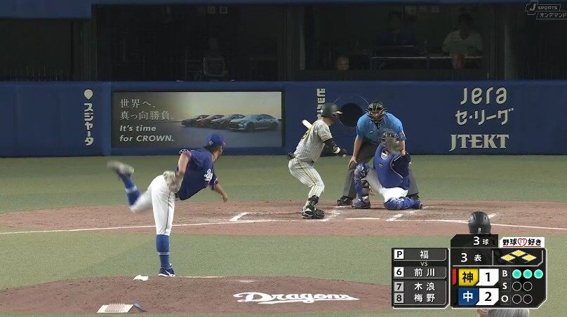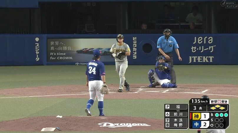 【中日対阪神20回戦】阪神、3回無死満塁から前川が押し出し四球で同点に追いつく!!!!!
