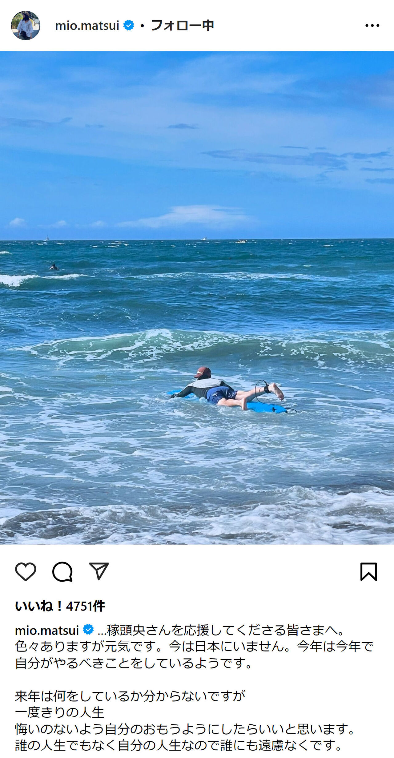 さらに「来年は何をしているか分からないですが 一度きりの人生 悔いのないよう自分のおもうようにしたらいいと思います」とし、「誰の人生でもなく自分の人生なので誰にも遠慮なくです」と記した。そして「写真は渡米する前に稲村ヶ崎の海にて」と大海原でサーフィンをする松井稼頭央氏の写真をアップした。