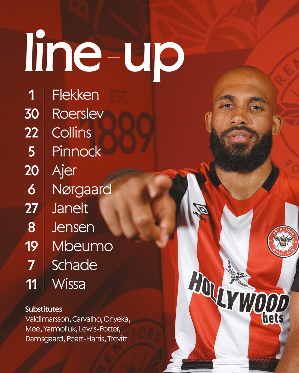 Flekken; Roerslev, Collins, Pinnock, Ajer; Norgaard(C), Janelt, Jensen, Mbeumo, Schade; Wissa.