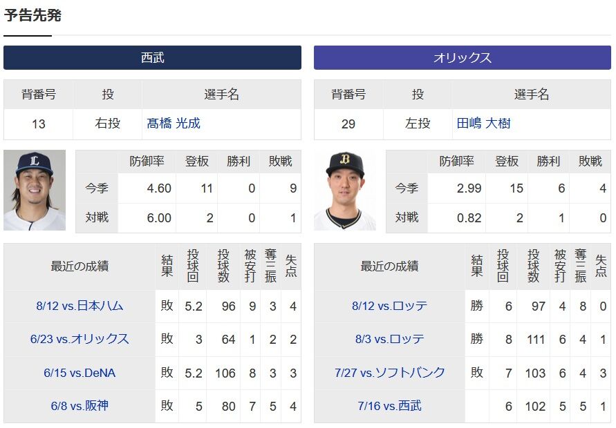 西武のエース高橋コ(11先発0勝9敗)開幕10連敗をかけて本日先発