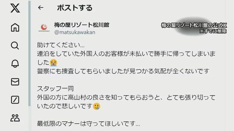 長野県高山村の旅館で、男女2人の外国人客が代金5万7000円を支払わないまま宿を後にし、連絡が取れなくなっている。支配人が取材に応じ、「みんなショックを隠し切れなかった」と悲痛な胸の内を語る一方で、受け入れ側にも課題があったと反省している。
