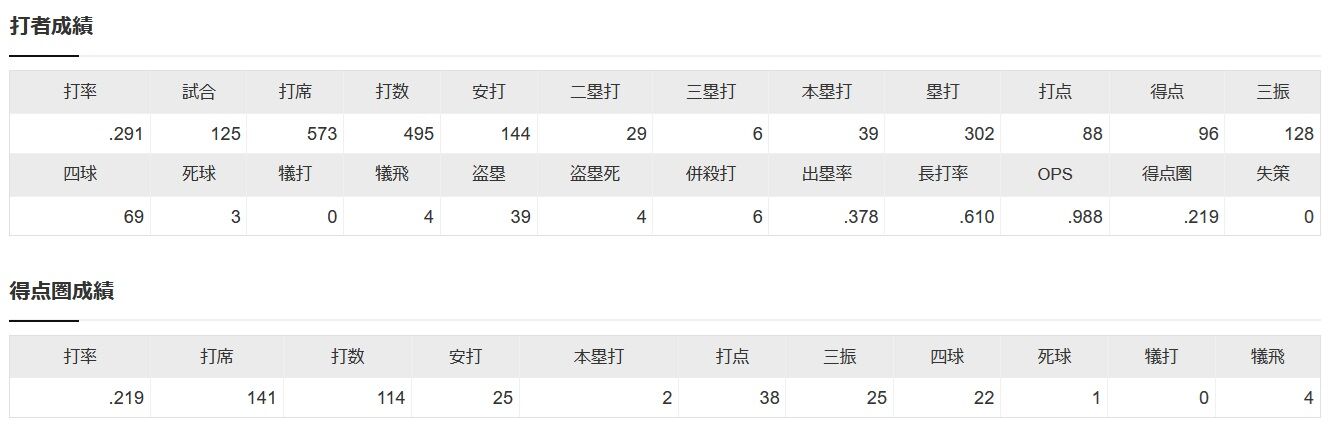 大谷翔平 .291(495-144) 39本 88打点 39盗塁 OPS.988 ←こいつの率直な感想