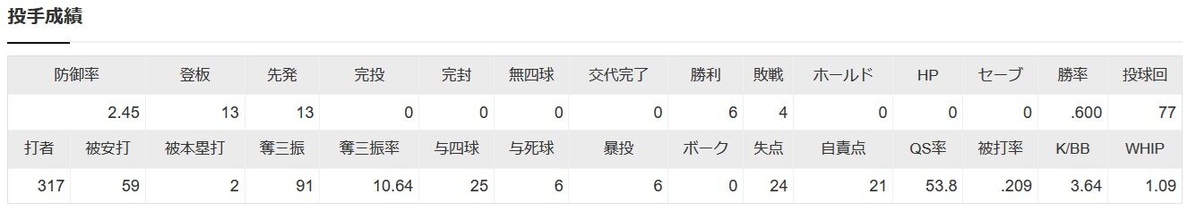 佐々木朗希(口)14先発77回6勝4敗防御率2.45