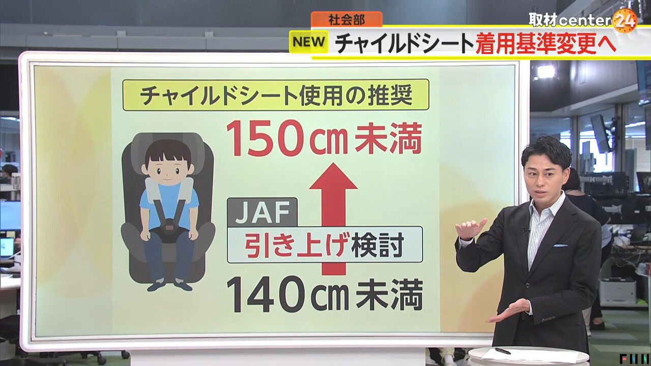 日本自動車連盟=JAFが、チャイルドシートの使用を推奨する基準をいまの身長140センチ未満から150センチ未満へ引き上げることを検討していることがわかりました。