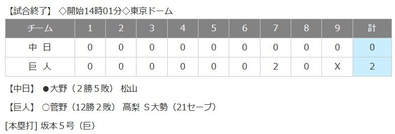 【巨人対中日22回戦】巨人が2-0で中日に勝利し3カードぶり勝ち越し!坂本が値千金先制5号2ラン!菅野がハーラートップ独走12勝目!中日は今季15度目の零敗
