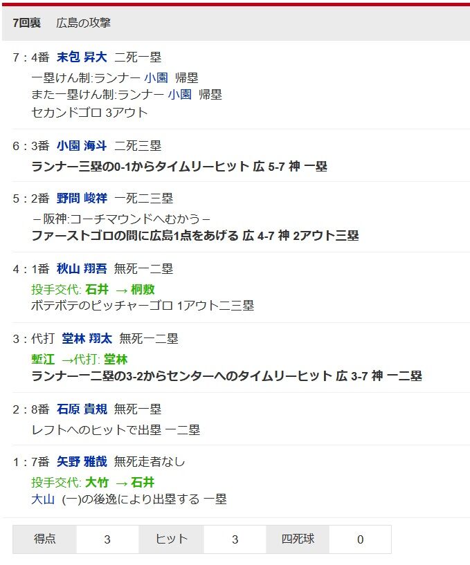 【広島対阪神22回戦】広島、7回に一挙3点を取り2点差に迫る!!!!!!!!!