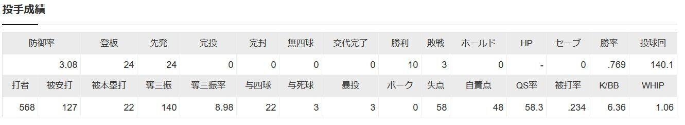 今永昇太(31)10勝3敗 3.08 140.1回 140奪三振