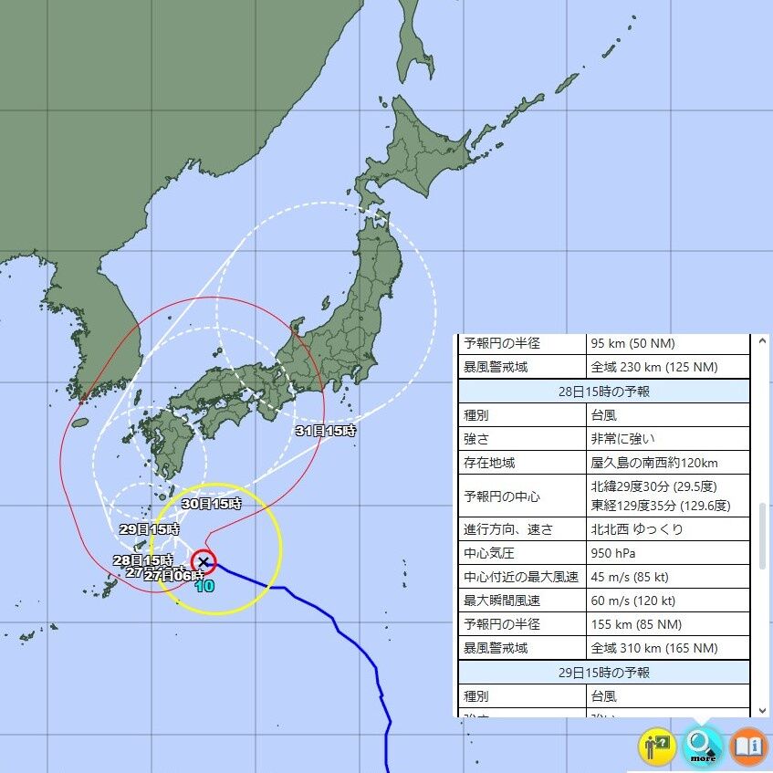 非常に強い台風10号さん、予報円がどんどん西に逸れてついに朝鮮半島上陸にまで可能性が広がる