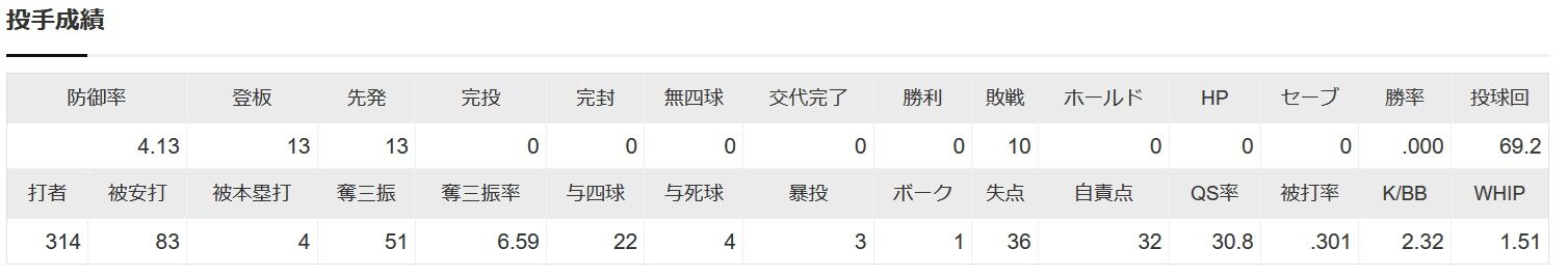 【悲報】高橋光成 10敗 0勝 防御率4.13